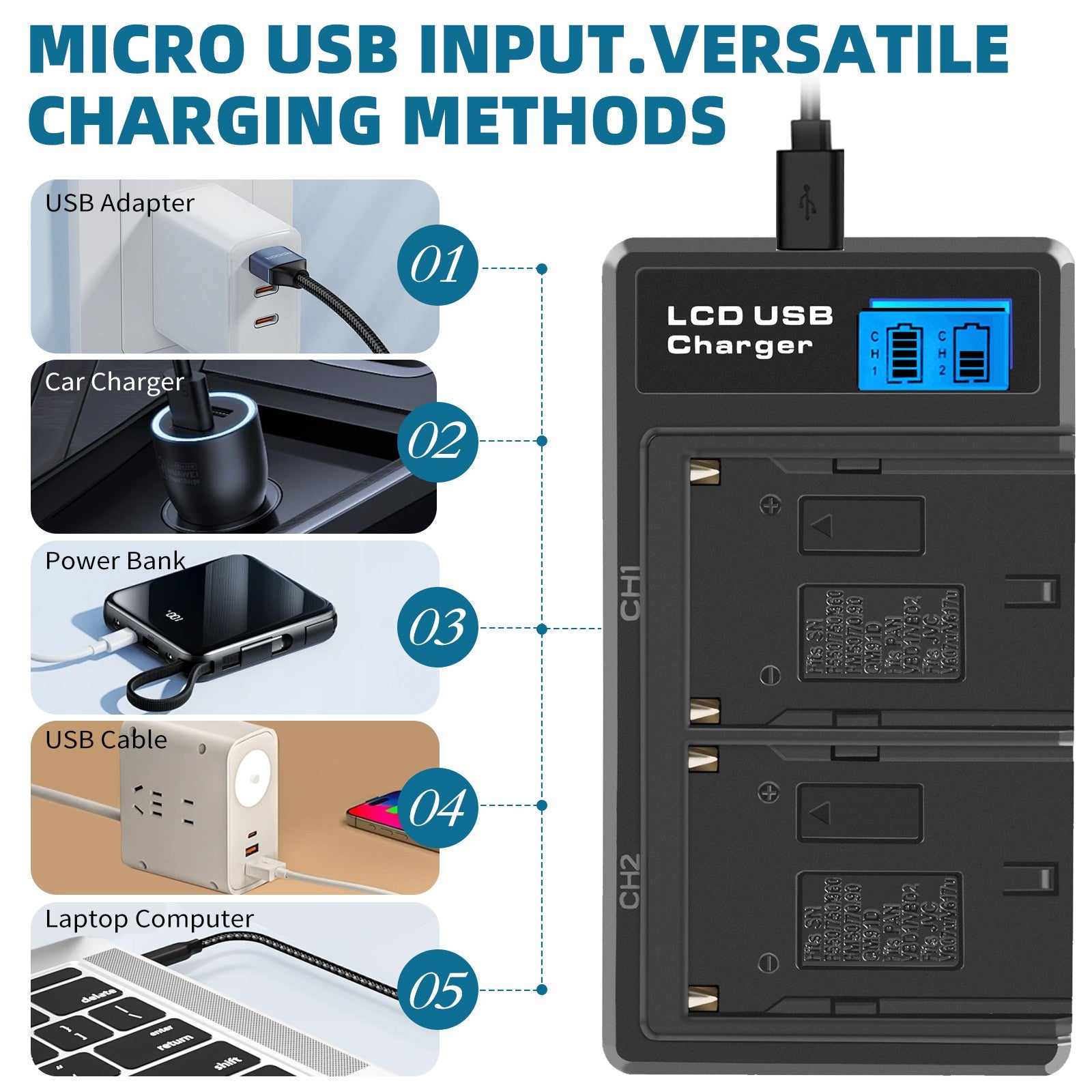 - Charge intelligente LCD : peut charger 2 batteries simultanément et indiquer le processus de charge sur l'écran LCD, empêchant la surcharge de la batterie.